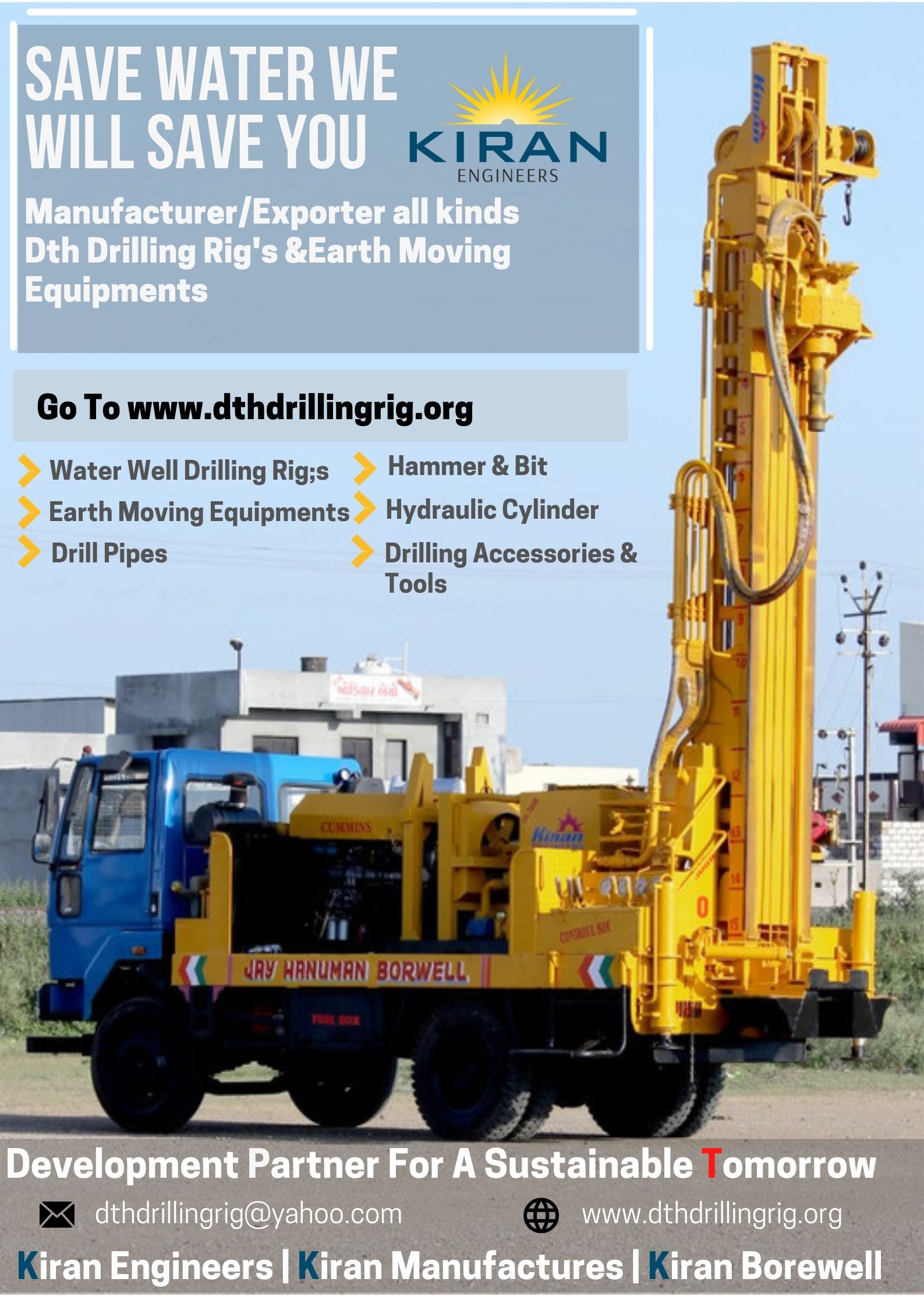Save Water We Will Save You. Development Partner For A Sustainable Tomorrow. Kiran Engineers, Rajkot, Gujarata (India) Manufacturer/Exporter All Kinds Dth Drilling Rig's And Sares. If Any Require Rig Machine Or Tools. Feel Free To Contact Us. E Mail : dthdrillingrig@yahoo.com Web : www.dthdrillingrig.org For Inquiry (Whatsapp) : +91 90166 12979, +91 99741 11110